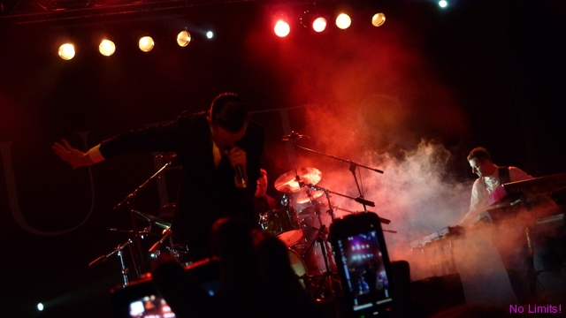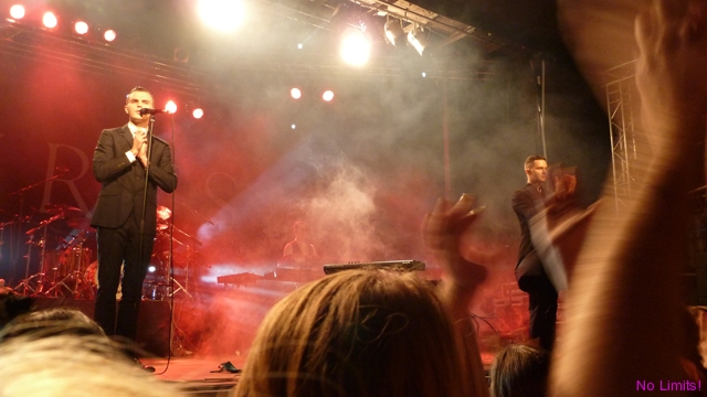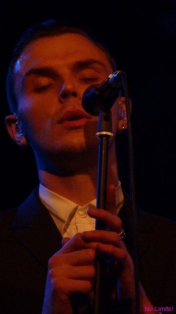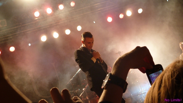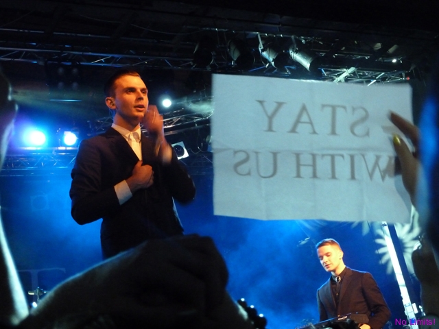 Koncert rozpoczął się spokojnie od „Unspoken”. Potem „Silver lining”, które na szczęście zabrzmiało bardziej jak pierwsza wersja niż wersja z płyty, i „Wonderful life” (na którym niestety napotkałam na pewne problemy techniczne). Jakiś czas później „Happiness” – i dobrze, bo to fajny kawałek, którego ostatecznie mogliby wcale nie grać, skoro nie ma go na płycie (tzn na podstawowej wersji), „Sunday”, „Illuminated”, „Evelyn” – jedyny moment, kiedy można było zobaczyć Adama w różnych miejscach sceny, „Stay” (okazuje się, że akcje na koncertach stają się coraz bardziej modne, choć myślę, że rzucanie grzebieniami, o którym słyszałam, zrobiłoby większe wrażenie ;-)), potem chwila adoracji Kylie Minogue w „Devotion” i „Confide in me”, a na końcu „Better than love” (choć dla mnie to idealna piosenka na początek). Poza tym były róże, rzucane w stronę publiczności kilkukrotnie, było chwytanie się za serce, natchnione spojrzenia, naśladowanie palcami spadających kropel deszczu i oczywiście „Ten” ruch brwią. Nic tylko się zakochać 😉 Było prawie wzniośle i prawie patetycznie, i choć można było w kilku momentach parsknąć śmiechem, to jednak nie sposób odmówić zespołowi wykreowania doskonale spójnego i w gruncie rzeczy interesującego wizerunku. A Theo na szczęście wcale nie jest na scenie tak statyczny, jakby się mogło wydawać. Jego zabawy statywem i kilka tanecznych ruchów nieodparcie kojarzyły mi się z wokalistą pewnego innego angielskiego, nieco starszego niż członkowie Hurts, zespołu.