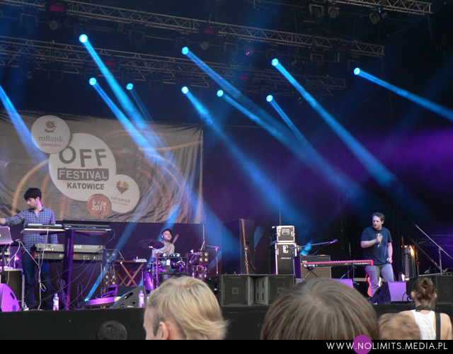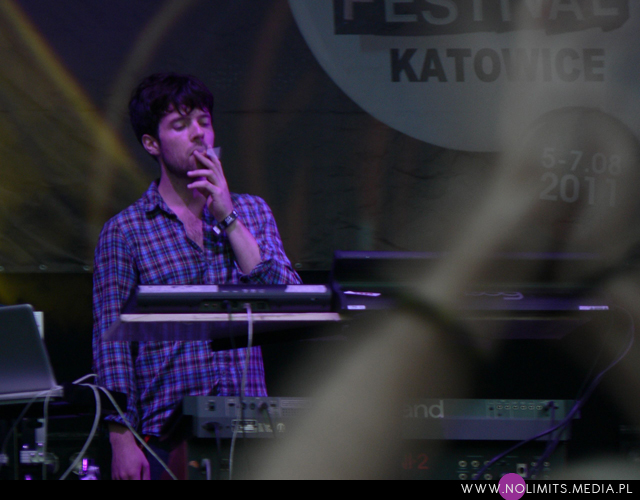 Kolejnym punktem programu był dla mnie wykonawca nr 2, który obok Matthew Deara przyciągnął mnie do Katowic. Mowa o Amerykanach z Neon Indian. Ich płyta wpadła mi w ręce już jakiś czas temu i choć muzycznie i aranżacyjnie mi się podobała, to produkcja sprawiła, że nigdy bliżej jej nie poznałam. Dużo wysokich tonów i przytłumienie tych niskich mogę wprawdzie docenić jako ciekawy zabieg artystyczny, tworzący swoiste charakterystyczne oldschoolowe brzmienie, nie potrafię go jednak polubić i pozbyć się wrażenia o niewykorzystanym potencjale. Cóż, jestem osobą, która kocha basy. Dlatego też z dużym zainteresowaniem czekałam na koncert. Byłam bardzo ciekawa jak na żywo zabrzmi muzyka wyprodukowana tak, żeby przypominała dźwięki wydobywające się z płyt winylowych odtwarzanych na słabym gramofonie (dokładnie takim, jak mój!) lub też ze starych kaset, które niejednokrotnie zostały wciągnięte przez magnetofon. Okazało się, że muzyka Neon Indian w wersji live jest o wiele bardziej czysta i klarowna. I nie pozbawiona basów! Wreszcie można było usłyszeć to, czego nie słychać na płycie. Sam koncert zaś był chyba najweselszym momentem całego festiwalu – muzyka czasem aż naiwnie słodka, roześmiana pani za klawiszami – Leanne Macomber, i mały, dość kobieco tańczący wokalista – Alan Palomo. Do tego podwójny ukłon w stronę Polski – wykonanie premierowego kawałka o swojsko brzmiącym tytule „Polish girl”, który znajdzie się na dopiero co ukończonej drugiej płycie zespołu.