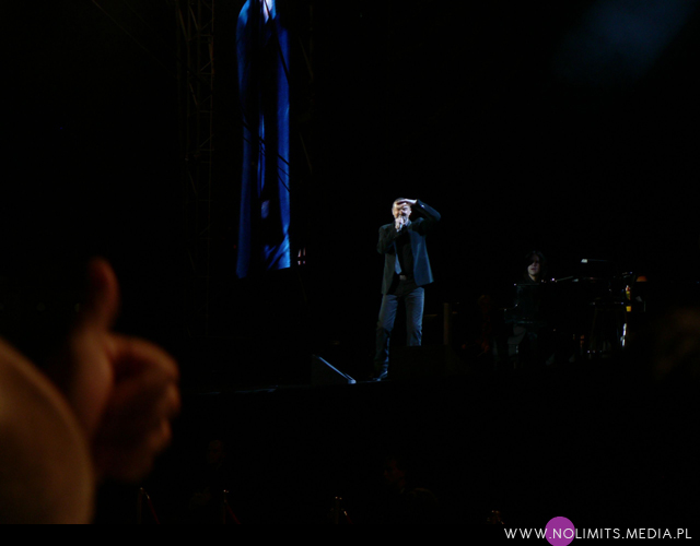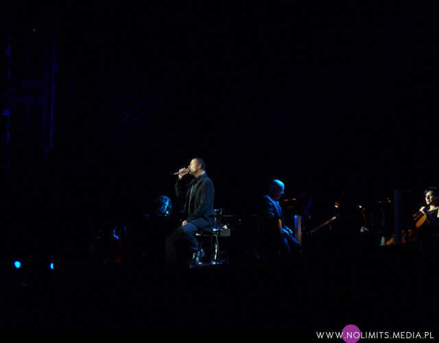 Samo widowisko rozpoczęło się o 20:30, po oficjalnym przywitaniu przez prezydenta Wrocławia i oddaniu salwy armatniej przez bractwo kurkowe. Orkiestra rozpoczęła „Through” a na scenę wszedł On. Rozbłysły światła i wtedy zaśpiewał. Boże, jaki on ma głos! Coś nieprawdopodobnego. Bez wysiłku, leciutko, delikatnie i jednocześnie mocno – talent absolutny. George na żywo brzmi identycznie, naprawdę identycznie jak na nagraniach studyjnych. Dosłownie nie ma żadnej różnicy. Dysponuje przy tym jedną z najczystszych barw głosu w muzyce rozrywkowej wszech czasów, porównywalnej chyba tylko z Artem Garfunkelem. I tutaj dochodzimy do sedna sprawy – bo o ile brzmienie George’a na żywo, które jest identyczne z tym z płyt jest ogromnym plusem, to analogiczne porównanie dotyczące muzyki – już nie bardzo. Przesłuchując ostatnimi czasy dyskografię George’a doszłam do wniosku, że trasa z towarzyszeniem orkiestry wcale nie jest w jego przypadku specjalnym zaskoczeniem, ponieważ w jego twórczości pełno jest trąbek, saksofonów, smyczków i wiolonczeli. I do setlisty zostały wybrane przede wszystkim te utwory, które już w oryginale były nagrane z towarzyszeniem orkiestry oraz te, które łatwo sobie w takiej aranżacji wyobrazić. Prym oczywiście wiodły covery z „Songs from the last century” – „My Baby just cares for me”, „Roxanne”, „Brother, can you spare a dime”, „Wild is the wind”, „You’ve changed”, „I remember you”. Do tego jazzujące „Kissing a fool”, walc „Cowboys and Angels”, „Praying for time” i „A Different Corner” z dyskretnymi skrzypcami, czy też przepiękne „You have been loved”, gdzie główny motyw zagrany jest na trąbce. Pozostałe covery, nie posiadające wersji studyjnej (w wykonaniu George’a) również w oryginale posiadają „orkiestrową” aranżację („Feeling good”, „Love is a losing game”) lub też łatwo je sobie w takiej wyobrazić („Going to a Town”). O dziwo za najlepszy moment koncertu uważam właśnie taki cover – wykonywany tylko live, w dodatku piosenki dość nowej i komercyjnej. Mowa o „Russian Roulette” Rihanny, które w wykonaniu George’a zyskało nową jakość. Niby aranżacja nie różni się wiele od oryginału, ale wokalnie George zjada Barbadoskę na śniadanie. To jak przepięknie wyciągał nuty w refrenie – czysta magia. Moc. Utwór jakby stworzony dla niego, prezentujący jego walory głosowe w pełnej krasie. Szkoda, że na moim filmiku tak tego nie słychać, ale na żywo miałam ciary. Jeden jedyny raz. I to chyba była jedyna niespodzianka tego wieczoru – fakt, że jego wykonanie jest tak genialne.