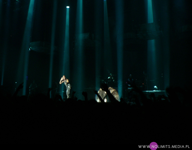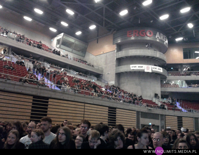 Muszę też wspomnieć nieco o stronie organizacyjnej i o samej Ergo Arenie. Z zewnątrz, jak wszystkie tego typu obiekty w Polsce, jest raczej mało urodziwa, ale przynajmniej jest „podpisana”. Czcionka jest brzydka i całość przypomina raczej centrum handlowe albo jakiś hipermarket, ale przynajmniej jest dobrze widoczna (czego nie można powiedzieć o łódzkiej Atlas Arenie). Sklepik, wzorem wrocławskiego George’a Michaela, można było znaleźć przed budynkiem, podobnie zresztą jak małą strefę jedzeniową. Ochrona informowała przez megafony, gdzie należy się ustawiać i czego na koncert wnieść nie wolno (standardowo: profesjonalne aparaty i większe oraz otwarte butelki plastikowe). Wejścia otwarto punktualnie o 18ej a kontrola biletów i toreb odbywała się sprawnie. Niestety dobre wrażenie prysło, gdy przyszła kolej na wizytę w szatni. Tu skojarzenia miałam raczej ze Spodkiem niż z Atlasem – chmara ludzi w nieskoordynowanej kolejce i trzy osoby obsługujące. Mało tego – szatnia była płatna!!! Dowiedziałam się, że podobnie to wyglądało kilka dni wcześniej na łódzkim koncercie Sade, ale mogłabym przysiąc, że ja nigdy w Atlas Arenie za szatnię nie płaciłam. Absolutnie głupie, bezsensowne i bezmyślne. Sam zaś gdański obiekt wydał mi się mały. To, co mi się natomiast podobało, to trybuny – w dolnej części chyba składane, bo nie wierzę, żeby zaczynały się tak wysoko.