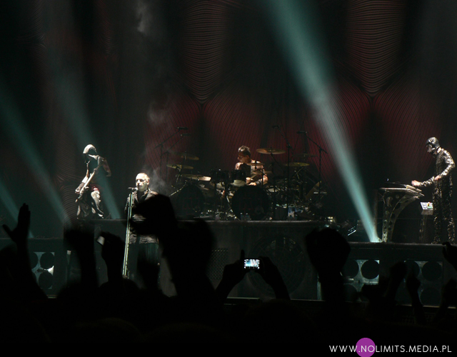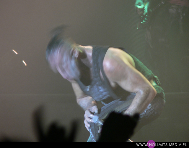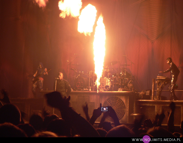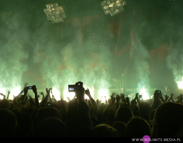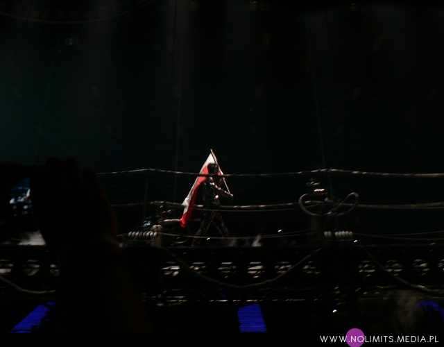 Zaczęło się majestatycznie. Zgasły światła, a z sufitu, nad głowami publiczności, zaczął zjeżdżać w dół buchający dymem podest-chodnik, łączący ze sobą dwie sceny – małą, umieszczoną mniej więcej w połowie płyty, oraz główną, dużą. Po chwili pojawił się zespół – przemaszerował przez publiczność w rytm plemiennych bębnów, a następnie chodnikiem nad naszymi głowami przeszedł na główną scenę – Oliver niosący pochodnię, za nim Richard i Paul, Flake z polską flagą, Christoph z flagą z logo R+ i na końcu Till. Na YouTubie to wejście trwało godzinami, na żywo, od momentu gdy zespół był już widoczny – chwilę. I w końcu stało się – rozległy się dźwięki chyba mojego ulubionego utworu Rammstein – „Sonne”. Pojawiły się pierwsze ognie i wówczas uwierzyłam w to, co zawsze słyszałam o ich koncertach – że pierwsze rzędy mają opalone brwi i rzęsy. Ja stałam na samym końcu golden circle – z rozmysłem, choć bez problemu mogłam przejść znacznie bliżej sceny – i nawet z takiej odległości czułam żar płomieni. Pierwsze „buchnięcie” to było naprawdę coś. Widzieć to w telewizji czy na monitorze komputera, a poczuć na żywo to jednak dwie zupełnie różne sprawy. Nawet jeśli wiedziałam, czego się spodziewać, to po prostu robiło wrażenie. Wow. A później potoczyło się już zgodnie z setlistą z Bratysławy (ok, w trochę innej kolejności): „Wollt ihr das Bett in flammen sehen”, „Keine Lust”, „Sehnsucht”, „Asche zu Asche”, „Feuer Frei!”. Podczas „Mutter” hala rozbłysła tysiącem światełek. Na „Mein Teil”, według mnie brzmiącym najmocniej z całego setu, oczywiście na scenę wjechał kocioł z Flake w środku a Till ugotował sobie z niego obiad, jak to czyni od 7 lat. Podczas „Du riechst so gut” Richard i Paul zaprezentowali płonące gitary. Z „Links 234” z kolei najbardziej pamiętam wymachującego w marszowym rytmie głową Christopha. Początek „Du hast” zabrzmiał o wiele głośniej i mocniej niż na nagraniach koncertowych, które znam. Szkoda tylko, że z miejsca, w którym stałam, słabo było słychać śpiew publiczności. Zapomniałam natomiast, że podczas „Haifisch” Flake wsiada do wielkiego pontonu i płynie wśród publiczności. Kolejne trzy utwory panowie wykonali na małej scenie, na którą zostali przeprowadzeni przez „chodnik” na smyczy przez Chrisopha, przebranego za kobietę (to oczywiście nawiązanie do „Mein Teil”). Do setlisty powróciło kontrowersyjne „Bück dich”, podczas którego Till i Flake inscenizują scenkę seksu analnego przy pomocy sztucznego penisa, z którego następnie na publiczność tryska ciesz imitująca spermę. Następnie „Mann gagen Mann” a potem totalna zmiana klimatu – chwytające za serce i wzruszające wręcz „Ohne dich” i powrót na główną scenę. I wreszcie moment, na który chyba najbardziej czekałam i największe zaskoczenie w setliście – moja druga obok „Sonne” miłość, której nigdy bym się na koncercie nie spodziewała, ponieważ nie była singlem – „Mein Herz brennt”. Długie, tajemnicze intro, które powoli przeszło w znany i przepiękny smyczkowy początek, podczas którego na scenę ponownie po kolei weszli członkowie zespołu (wcześniej nastąpiła krótka przerwa) – na mnie to ten moment zrobił największe wrażenie. Do tego dosłowna wizualizacja tytułu – pikające, podświetlane serce na piersi Tilla i coś, co trzymane w jego wyciągniętej dłoni płonęło – trudno mi było dostrzec kształt, ale wytłumaczyłam sobie, że to też serce. To powinno być serce. Po tych, jak dla mnie najbardziej podniosłych minutach koncertu, rozbrzmiała „Amerika” a z armatek ustawionych po bokach i na środku sceny wystrzeliło kolorowe konfetti – tym razem w barwach polskich, nie amerykańskich, w każdym razie niebieskiego nie zauważyłam. A potem już tylko „Ich will”, „Pussy” z kolejnym penisem na scenie – tym razem w postaci armatki, która miała tryskać pianą, ale niestety po raz kolejny zawiodła (oczywiście na drugim koncercie już działała) oraz finałowe „Engel” , rozpoczynające się legendarnym już dla mnie gwizdaniem (pomimo moich obaw bardzo dobrze słyszalnym), podczas którego Till przywdział ogromne, metalowe skrzydła, buchające płomieniami. I to był koniec. Na pożegnanie wokalista powiedział swoim niskim głosem jeszcze tylko trzy rzeczy: