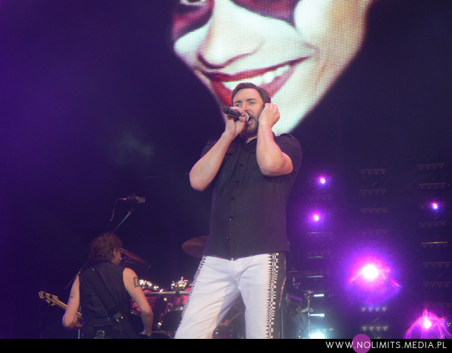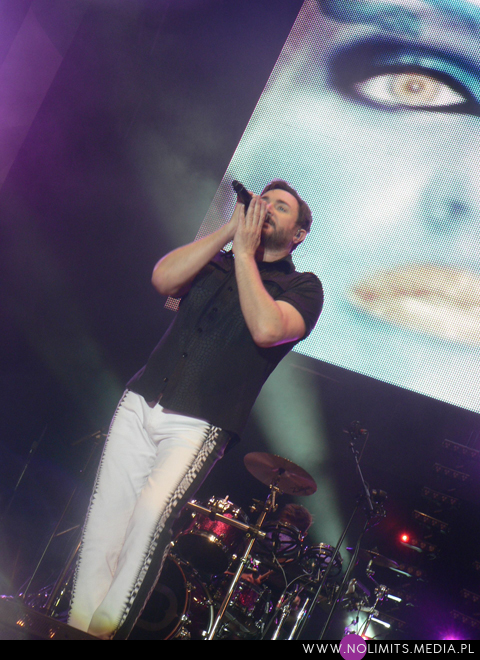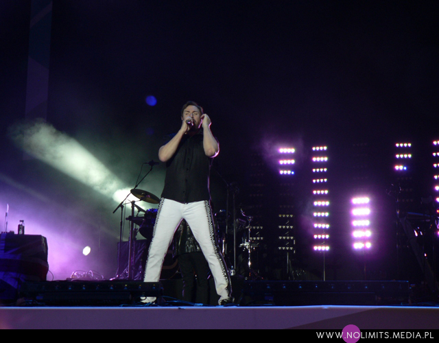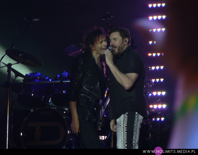 Setlista nie stanowiła dla mnie zaskoczenia, od jakiegoś bowiem czasu przygotowuję się wcześniej, skutkiem czego niestety omijają mnie niespodzianki. Zaczęło się podniośle – od instrumentalnego, smyczkowego intra, w które wpleciony został fragment „All you need is now”. Po nim nastąpił wolny „Before the rain” – dla mnie potomek Chauffeura. A później królowały już w większości stare, doskonale znane numery, poprzelatane gdzieniegdzie nowszymi utworami. Jak ja mogłam nazwać set z Warszawy „setem-marzenie każdego laika”? Tam to dopiero grali dużo nowych kawałków! Szkoda, bo prawdę mówiąc wolałabym żeby było na odwrót. Nie doczekałam się zatem we Wrocławiu „Blame the machines” 🙁 Zabrakło też granego dotychczas „The Man who stole a Leopard”. Ostatnią płytę, oprócz utworu tytułowego i wspomnianego już kawałka otwierającego koncert, reprezentowały „Safe (in the heat of the moment)” i singlowy „Girl panic!”. Były za to wszystkie hity – „Planet Earth”, „A view to a kill”, „The reflex” z fantastycznym wyjściem Simona do fosy i rozmową z „Przemkiem Le Bon” (do obejrzenia na filmiku), „Come undone”, „Is there something I should know”, „Save a prayer”, „Notorious” (niestety karta pamięci wypluła błąd, w związku z czym końcówka filmiku została ucięta :(), „Careless memories”, „Ordinary world” (ku czci przemian politycznych w Egipcie i Syrii), „Hungry like a wolf”, „Wild Boys”, w które nareszcie wpletli fragment „Relax” Frankie Goes to Hollywood (podobieństwo tych piosenek jest chyba oczywiste), a na bis naturalnie „Girls on film” i „Rio”. Nie zabrakło także doskonałego koncertowo „(Reach up for the) Sunrise”, choć słońca podczas koncertu trudno było uraczyć. „Before the rain” faktycznie ustawiło pogodę na cały występ i niestety „Sunrise” niczego już w tym temacie nie zmieniło.