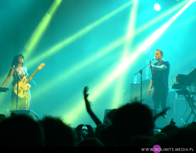 No i się udało. M83 znowu zagrało na Open’erze, i znowu w namiocie. Trudno jednak było im zmierzyć się z legendą tamtego koncertu, którą sama stworzyłam w mojej głowie. Choć zaczęło się fantastycznie: obrazkiem jak z filmu Sci-Fi Spielberga dla młodzieży – na scenę wkroczyła postać znana z okładki singla „Midnight city”, wyciągnęła dłoń i omiotła publiczność zielonymi wiązkami światła lasera. A potem na scenie pojawił się Anthony i jego charakterystyczny głos, wraz z nim zaś jego partnerka. I tu rozczarowanie. Wyglądała niczym Sarah Brightman. Długie (miałam wrażenie, że doczepione), falowane włosy, do tego kiczowata sukienka. Sarah Brightman z Dynastii. Wywołała u mnie niesmak. Wokalnie też niestety nie do końca mi się podobała, zwłaszcza poprzez niepotrzebne wyciąganie „We owe the sky”. No i właśnie, skoro o przedostatniej płycie mowa, niestety zabrakło mojego ukochanego „Skin of the night”. Nie mogę tego odżałować. Nie było także „Kim & Jessie”. Ogromne wrażenie zrobił za to zupełnie niepozorne na płycie „Sitting”, podczas którego gitarzysta i klawiszowiec, Jordan Lawlor, ustawił się z pałeczkami vis-a-vis wokalistki i fantastycznie przebierał nogami, wygrywając rytm. „Sitting” w wersji studyjnej brzmi niczym dzieło Neon Indian, w wersji live nie ma natomiast śladu po Lo-Fi. Brzmienie jest pełne i porywające. Nie zabrakło na szczęście „Colours”, które także uwielbiam. Jednak „A quitar and a heart” zostało zagrane w takiej wersji, że go nie rozpoznałam. Dopiero przeglądając setlistę po koncercie przeczytałam, że to był remix. Fantastycznie za to zabrzmiało „Midnight city”. Faktycznie, Anthony dorobił się przeboju.