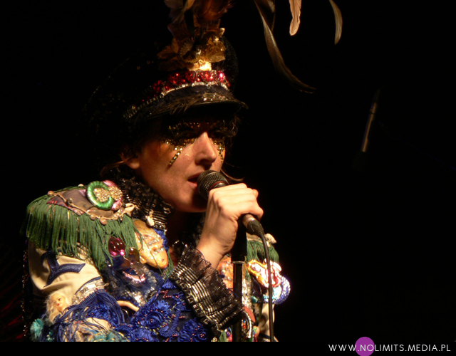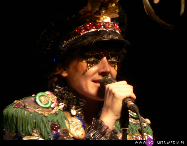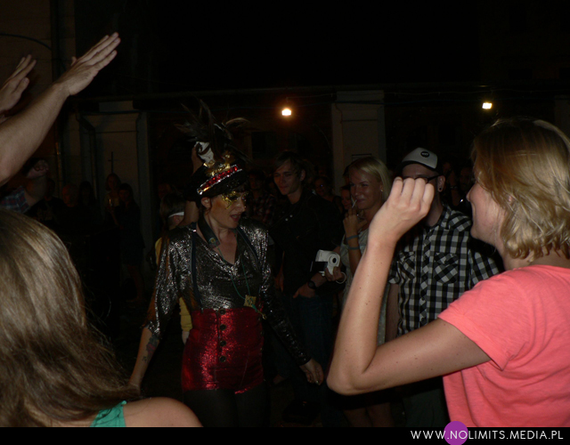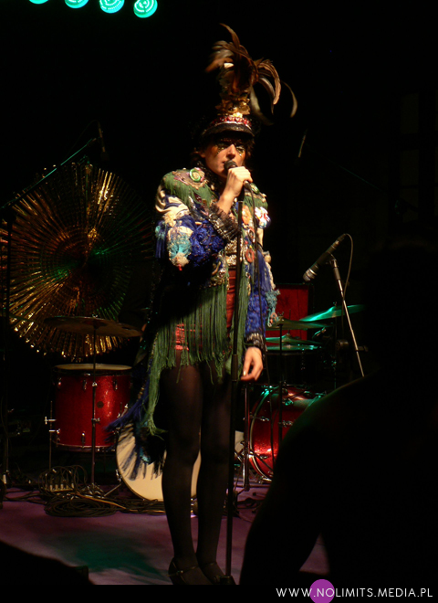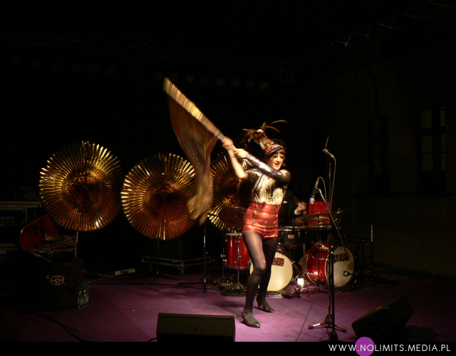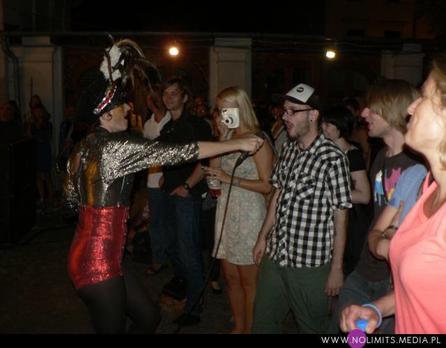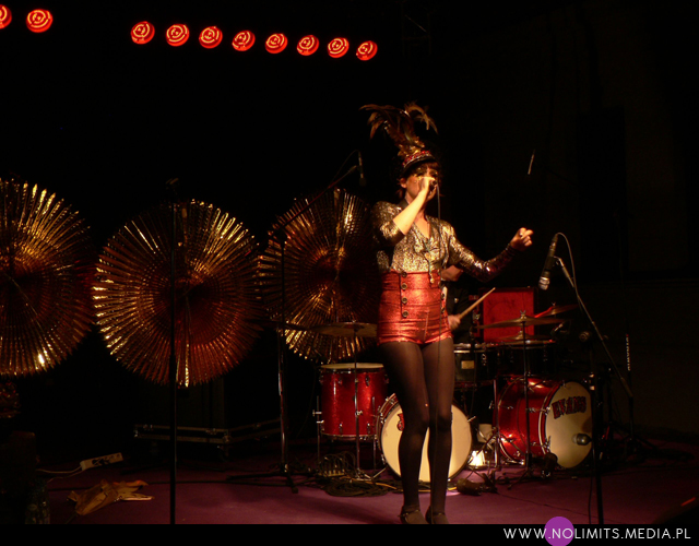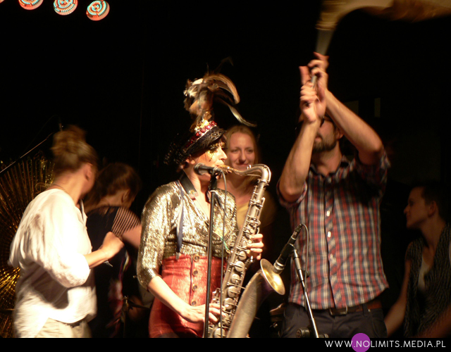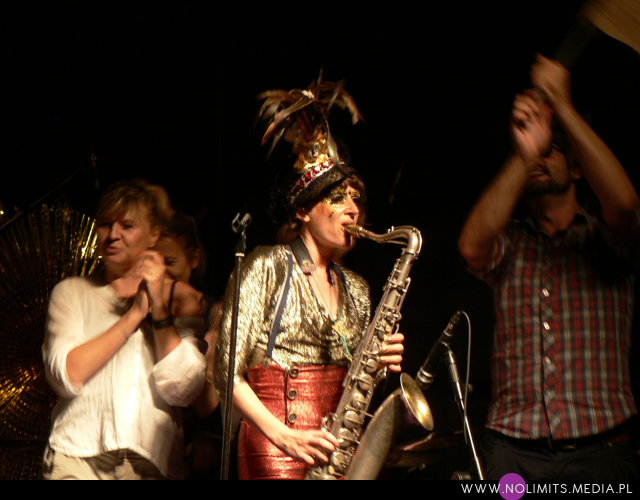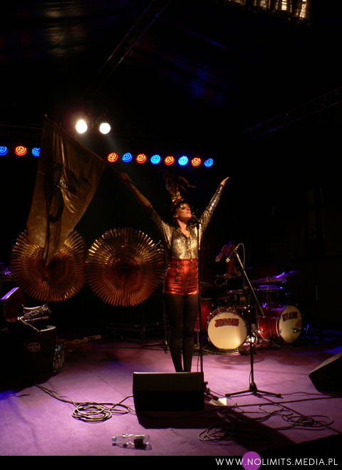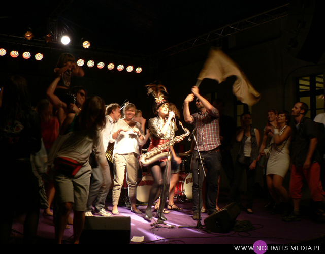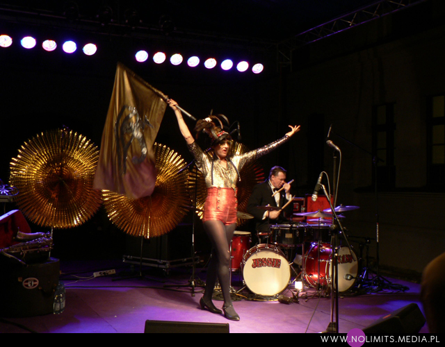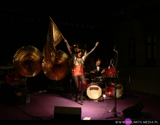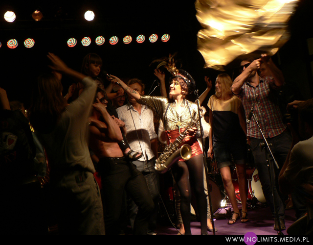 Nie do końca wiedziałam, czego się spodziewać, ale gdy tylko pojawiła się na scenie, wszystko stało się jasne. Złota, błyszcząca bluzeczka, czerwone kuse spodenki, czapka z piórem, mocny brokatowy makijaż – połączenie showgirl i dziewczyny z orkiestry dętej, a wszystko to w klimacie lat 20-tych. Całość dopełniał fantastyczny retro taniec – charleston. I oczywiście muzyka. Moje niewprawne ucho słyszało mieszankę ragtime’u i jazzu w połączeniu z gorącymi, latynoskimi rytmami, a wszystko to delikatnie unowocześnione subtelną, chłodną elektroniką. Nie było w tej muzyce typowej radości, ale była energia. Psychodeliczna, powiedziałabym, że w pewnym sensie nawet motoryczna energia. Brak łatwych do zanucenia melodii, ale jednocześnie dużo wokalu i kilka wpadających w ucho motywów. W wersji studyjnej nie jest to muzyka dla każdego i na każdą okazję. Potrzebny jest jej odpowiedni moment by zainteresować, by nie zmęczyć i nie przytłoczyć. W wersji koncertowej zaś momentalnie wciąga, porywa i wydaje się po prostu przystępniejsza – zapewne przez bezpośredni kontakt z Jessie, która na scenie jest prawdziwym wulkanem energii. Charyzmy jej nie brakuje, to fakt. Śpiewa, tańczy, gra na saksofonie, wymachuje chorągwią, zmienia wdzianka, aż wreszcie wciąga publiczność w szaloną zabawę. No właśnie, przez mniej więcej 1/3 koncertu publiczność stała oddalona o jakieś 10 kroków od sceny, zostawiając miejsce jedynie dla dwóch mocno bawiących się osobników na przodzie. Do czasu aż Jessie zeszła z niskiego podestu i nakłoniła ludzi do śpiewania prostych chórków. Później już regularnie krążyła między sceną a widownią. Tańczyła wśród ludzi, śpiewała, maszerowała z chorągwią, aż w końcu dosłownie wypchnęła publikę na scenę. Wyglądało to tak, jakby stwierdziła, że jest tam zbyt ciasno do wykonywania szalonych wymachów nogami i rękami, i dlatego postanowiła zamienić się z widownią miejscami. Po jednym utworze ludzie grzecznie opuścili scenę, ale zabawa trwała nadal. I nie było już pustych miejsc, jak na początku koncertu. Nawet, gdy występ się skończył a z głośników popłynęła inna muzyka, Jessie została wśród publiczności i na mocno nierównym bruku, w obcasach, kontynuowała swój taniec. Nie dość, że zagrała świetny koncert, rozkręciła publiczność, to jeszcze zaaranżowała afterparty.