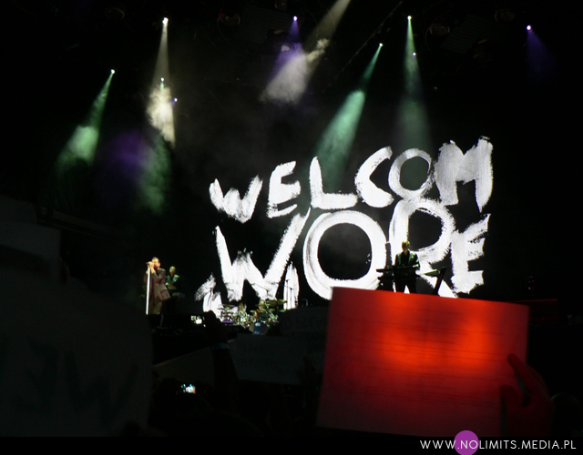 Światło zgasło nagle, rozległ się ryk publiczności i zaczęło się. Pierwsze dźwięki „Welcome to my world” przypominają nieco „Painkillera”, granego w 1998 roku (miłe skojarzenie). Rozdawane przed koncertem i drukowane wcześniej przez fanów kartki A4 z napisem „Welcome to Poland” całkowicie zasłoniły mi widok. Wejście Christiana Eignera, Petera Gordeno, Andy’ego Fletchera, Martina Gore’a i Dave’a Gahana mogłam więc oglądać tylko na wyświetlaczu mojego aparatu. Gdy zabrakło już sił do trzymania kartek w górze zrobiło się naprawdę ekstremalnie spokojnie. Bardzo dawno nie stałam wśród tak spokojnych i kulturalnych ludzi, którzy nie przepychali się, nie wymachiwali rękoma na wszystkie strony, nie skakali na boki, depcząc przy tym wszystkich wokoło, nie dźgali pieszczochami, bransoletkami czy zegarkami, nie rozlewali piwa i nie smrodzili dymem z papierosów czy innego zielska, a którzy po prostu bawili się w obrębie swoich kilku centymetrów, nie przeszkadzając innym. Z jednej strony mogło to wyglądać trochę niemrawo, z drugiej – o takim towarzystwie zawsze marzę.