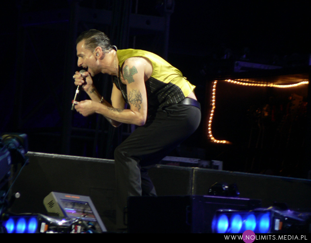 Obecnie prezentowany set z jednej strony nie jest setem moich marzeń, ale z drugiej zawiera dwa utwory, których na żywo jeszcze nie słyszałam, a które uwielbiam. Przeglądając listę utworów w internecie stwierdziłam, że tworzą iście schizofreniczną mieszankę. Szybki – wolny, smutny – wesoły, straszliwa emocjonalna huśtawka, gdzie nic do siebie nie pasuje. Ale podczas koncertu w ogóle się już nie zastanawiałam czy coś do siebie pasuje, czy nie. Łyknęłam wszystko. Zabrakło „Behind the wheel”, „World in my eyes” i przede wszystkim „Stripped”, które zrobiło na mnie ogromne wrażenie pod gołym niebem Legii. Zespołowi wciąż nie znudziło się za to wyeksploatowane do granic możliwości „Walking in my shoes” (tu zmieniono jednak przynajmniej początek), „I feel you” (charakterystyczny dźwięk rozpoczynający utwór w wersji studyjnej zszedł gdzieś na dalszy plan) oraz „Policy of truth”, którego fenomenu nigdy nie rozumiałam (choć muszę przyznać, że perkusja rozpoczynająca ten kawałek w wersji live brzmi bardzo fajnie). Ale co z tego, skoro darłam się przy tych kawałkach jak głupia (i już wiem, że chyba w końcu się przełamię i w lutym w Łodzi nagram wreszcie „Walking…”). I nawet na „Just can’t get enough” miałam radochę (choć marzy mi się, żeby zagrali „Photographic” w wersji płytowej). Cieszę się, że z nowych rzeczy (w sumie 7 utworów) grają „Angel” oraz „Soothe my soul”. Obecność „Welcome to my world” jest chyba oczywista, podobnie zresztą jak zamykającego właściwą część setu „Goodbye” (które na marginesie nie zrobiło na mnie takiego wrażenia, jakiego się spodziewałam). „Should be higher”, choć rozpoczynające się fantastycznym powolnym bitem i z wydłużoną końcówką, podczas której Gahan zachęca publiczność do śpiewania „looooooove” (czyli najtrudniejszego fragmentu z całej płyty) oraz „Secret to the end” wypadły moim zdaniem blado (choć jakimś dziwnym trafem odbieram tak wszystkie piosenki Gahana w wersji koncertowej). Z kolei „Heaven” naprawdę mi się podobało – zabrzmiało soczyście, nie przypominając niczego, co wcześniej stworzył zespół. Arcyciekawym posunięciem było ponowne (po 12 latach) włączenie do setu „Halo”, tym razem jednak w remiksie Goldfrapp i z przepięknymi wizualizacjami Berlina. W remiksie zabrzmiało także „A pain that I’m used to”, czyli pierwszy utwór Depeche Mode, jaki kiedykolwiek słyszałam na żywo. W tej wersji miał nieco mniej energii, ale wersja koncertowa remiksu podobała mi się bardziej od wersji studyjnej (Jacques Lu Cont’s Remix). Najsłabszym ogniwem było moim zdaniem „Precious”. Niby ładny początek, niby poprawny bit, ale po prostu mogli sobie darować ten utwór. Martin Gore miał swoje pięć minut śpiewając „Higher love” w oryginalnej aranżacji, powtórnie (po Łodzi) „Shake the disease” (a mogło być „But not tonight”…) oraz „Home”, podczas którego wyszedł na wybieg i zachęcał publiczność do śpiewania końcówki. Tak ruchliwego Gore’a jeszcze nie widziałam 😉 Jak dla mnie mógłby zaśpiewać „Always” z ostatniej płyty – byłoby ciekawie.