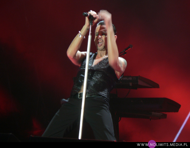 Obecnie prezentowany set z jednej strony nie jest setem moich marzeń, ale z drugiej zawiera dwa utwory, których na żywo jeszcze nie słyszałam, a które uwielbiam. Przeglądając listę utworów w internecie stwierdziłam, że tworzą iście schizofreniczną mieszankę. Szybki – wolny, smutny – wesoły, straszliwa emocjonalna huśtawka, gdzie nic do siebie nie pasuje. Ale podczas koncertu w ogóle się już nie zastanawiałam czy coś do siebie pasuje, czy nie. Łyknęłam wszystko. Zabrakło „Behind the wheel”, „World in my eyes” i przede wszystkim „Stripped”, które zrobiło na mnie ogromne wrażenie pod gołym niebem Legii. Zespołowi wciąż nie znudziło się za to wyeksploatowane do granic możliwości „Walking in my shoes” (tu zmieniono jednak przynajmniej początek), „I feel you” (charakterystyczny dźwięk rozpoczynający utwór w wersji studyjnej zszedł gdzieś na dalszy plan) oraz „Policy of truth”, którego fenomenu nigdy nie rozumiałam (choć muszę przyznać, że perkusja rozpoczynająca ten kawałek w wersji live brzmi bardzo fajnie). Ale co z tego, skoro darłam się przy tych kawałkach jak głupia (i już wiem, że chyba w końcu się przełamię i w lutym w Łodzi nagram wreszcie „Walking…”). I nawet na „Just can’t get enough” miałam radochę (choć marzy mi się, żeby zagrali „Photographic” w wersji płytowej). Cieszę się, że z nowych rzeczy (w sumie 7 utworów) grają „Angel” oraz „Soothe my soul”. Obecność „Welcome to my world” jest chyba oczywista, podobnie zresztą jak zamykającego właściwą część setu „Goodbye” (które na marginesie nie zrobiło na mnie takiego wrażenia, jakiego się spodziewałam). „Should be higher”, choć rozpoczynające się fantastycznym powolnym bitem i z wydłużoną końcówką, podczas której Gahan zachęca publiczność do śpiewania „looooooove” (czyli najtrudniejszego fragmentu z całej płyty) oraz „Secret to the end” wypadły moim zdaniem blado (choć jakimś dziwnym trafem odbieram tak wszystkie piosenki Gahana w wersji koncertowej). Z kolei „Heaven” naprawdę mi się podobało – zabrzmiało soczyście, nie przypominając niczego, co wcześniej stworzył zespół. Arcyciekawym posunięciem było ponowne (po 12 latach) włączenie do setu „Halo”, tym razem jednak w remiksie Goldfrapp i z przepięknymi wizualizacjami Berlina. W remiksie zabrzmiało także „A pain that I’m used to”, czyli pierwszy utwór Depeche Mode, jaki kiedykolwiek słyszałam na żywo. W tej wersji miał nieco mniej energii, ale wersja koncertowa remiksu podobała mi się bardziej od wersji studyjnej (Jacques Lu Cont’s Remix). Najsłabszym ogniwem było moim zdaniem „Precious”. Niby ładny początek, niby poprawny bit, ale po prostu mogli sobie darować ten utwór. Martin Gore miał swoje pięć minut śpiewając „Higher love” w oryginalnej aranżacji, powtórnie (po Łodzi) „Shake the disease” (a mogło być „But not tonight”…) oraz „Home”, podczas którego wyszedł na wybieg i zachęcał publiczność do śpiewania końcówki. Tak ruchliwego Gore’a jeszcze nie widziałam 😉 Jak dla mnie mógłby zaśpiewać „Always” z ostatniej płyty – byłoby ciekawie.