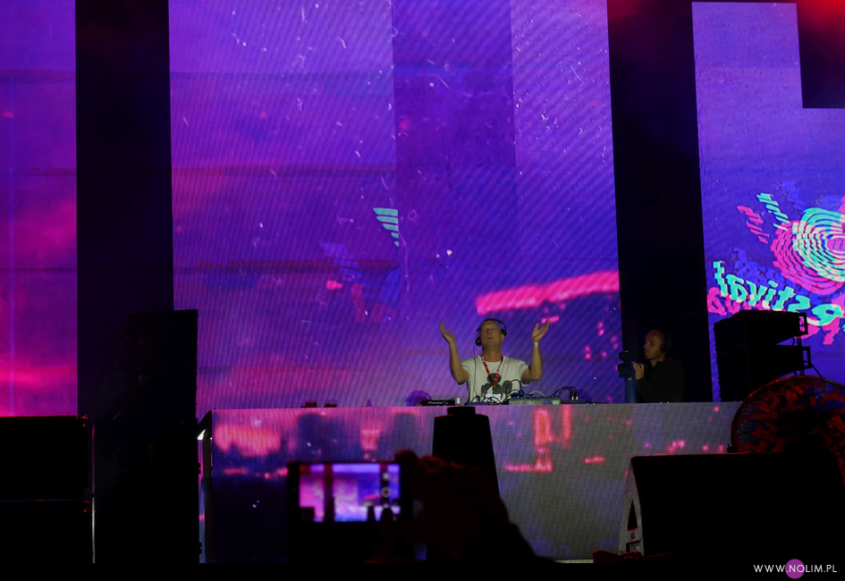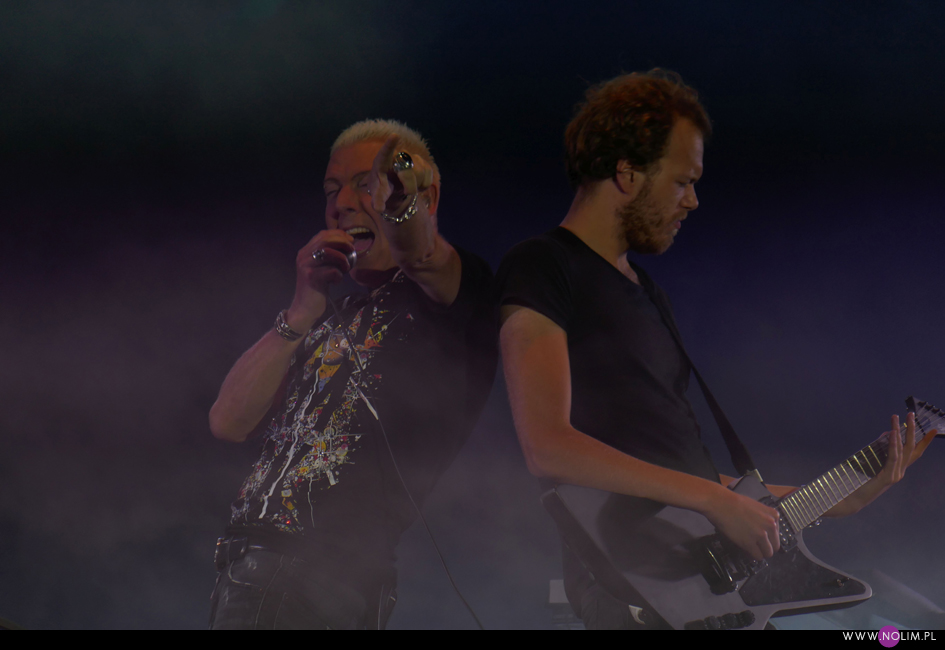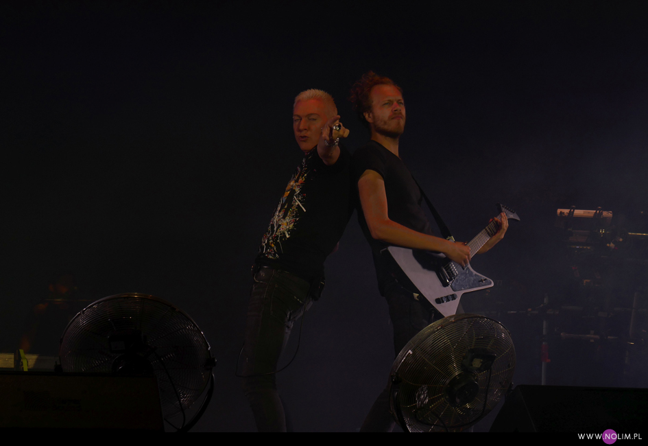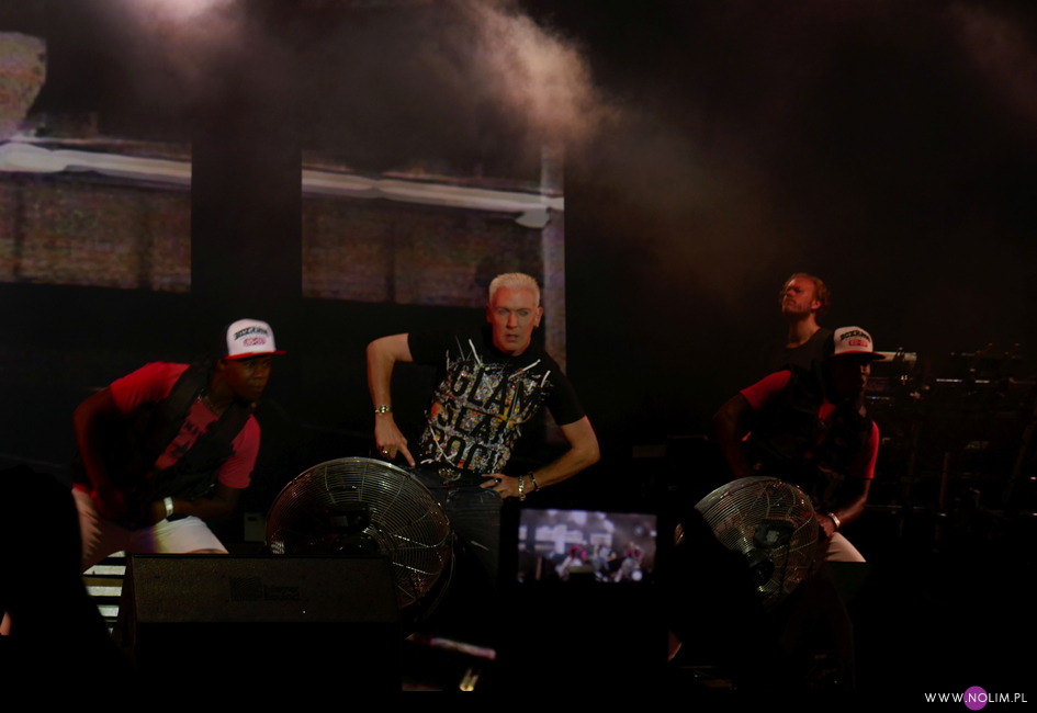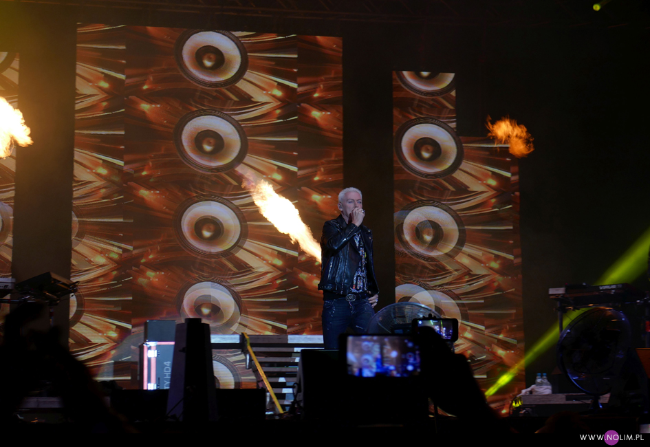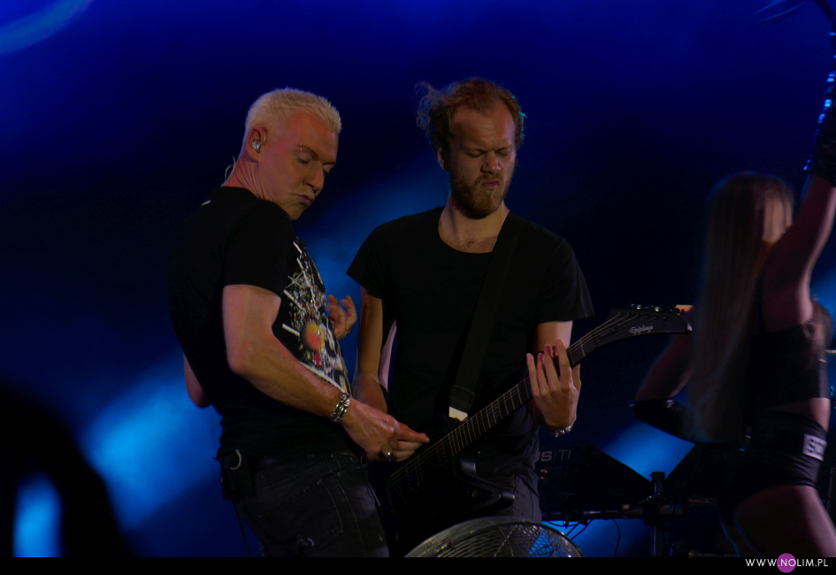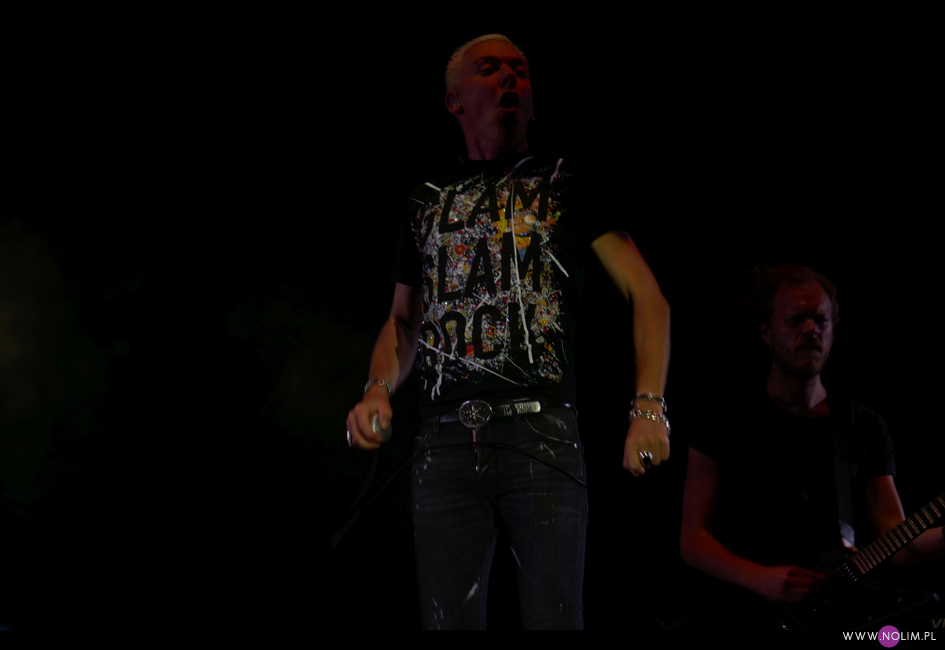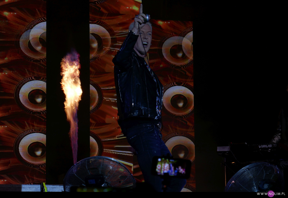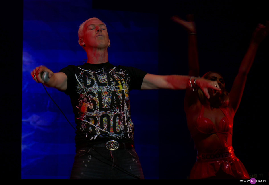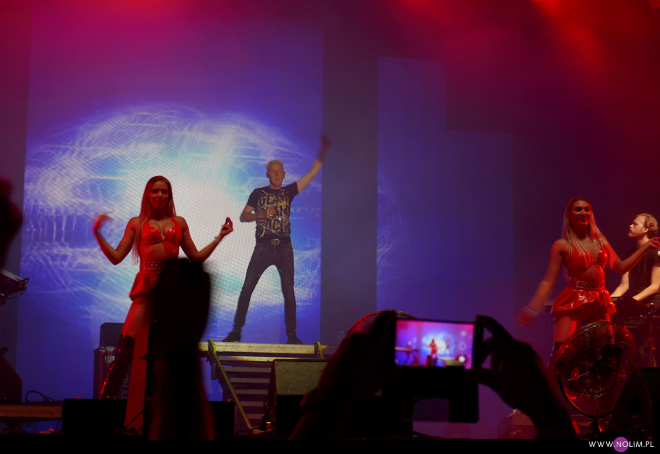 Scooter pojawił się na scenie zgodnie z rozkładem – o północy. To on przyciągnął największe rzesze fanów, choć grał również na poprzedniej edycji festiwalu. Już od pierwszych koncertów w przerwach publika skandowała charakterystyczne „Tu tu tu tu rurutu tu” z „Maria (I like it loud)” (tak na marginesie to nawet nie jest piosenka z lat 90-tych). W internecie pojawiły się narzekania na długość koncertu, który zaplanowano na jedną godzinę. Kiedy jednak w ramach przygotowań ułożyłam sobie playlistę z utworów, które ostatnio wykonywali panowie okazało się, że trwa ona właśnie około 60 minut. Utwory Scootera są po prostu krótkie, ale przy tej intensywności godzinny koncert jest idealny. Naprawdę nie czuć, że to tylko godzina. Człowiek w tym czasie zdąży się wyszaleć, wyskakać i wyśpiewać jak na koncercie przynajmniej dwa razy dłuższym. Na tle wszystkich pozostałych wykonawców Scooter to jednak prawdziwa gwiazda. To chyba jeden z niewielu, o ile nie jedyny przedstawiciel muzyki tanecznej z lat 90-tych, który cały czas wydaje płyty (i to z oszałamiającą regularnością) i cały czas pozostaje na szczycie. To jest zespół, który potrzebuje kilkunastu minut żeby rozstawić się na scenie. To jest zespół, który daje show, który ma własne tancerki, własnych tancerzy, własny ogień (tak, tak, czułam go na własnej skórze), serpentyny i konfetti. Moja droga do Scootera była długa, ale muszę przyznać, że znam ich i pamiętam od samego początku ich kariery – od znienawidzonego przeze mnie „Hyper hyper”, przez ukochane „I’m raving”, zabawne „Aiii shot the DJ” , poważne „Lass uns tanzen” aż po przebojowe „Mary Got No Lamb” i zawadiackie „Oi!”. Aż trudno uwierzyć, że od czasu, gdy po raz pierwszy zobaczyłam ich na Vivie minęły 23 lata. W tym czasie H.P.Baxxter z ravera zmienił się w rockmana w skórzanej kurtce i obcisłych jeansach, a muzyka zespołu, którego skład ewoluował kilkukrotnie, czerpała natchnienie z hard rocka, country, disco czy muzyki operowej, pozostając jednak cały czas hardkorowo taneczna. I tak oto spotkałam się z kolejną legendą. Tak, właściwie, biorąc pod uwagę fakt, że znam ich przez 2/3 mojego życia, są już dla mnie legendą. Wreszcie zobaczyłam na żywo to, o czym czytałam w Bravo. Te miny, gesty, wyszczerzone zęby i gitarę podczas „Fire”, która jednak niestety nie strzelała sztucznymi ogniami. Ale to nic. Show rozpoczęło się od bardzo długiego intro, po którym rozległy się dźwięki najnowszego singla tria – „Bora Bora Bora”. Szczerze mówiąc nawet nie zauważyłam, kiedy H.P. pojawił się na scenie. Był dym… i nagle go zobaczyłam i usłyszałam. Natężenie dźwięku było porażające, wszystkie piosenki, nawet te, za którymi nie przepadam, brzmiały doskonale i porywały do tańca. H.P. był non stop w ruchu – skakał, tańczył, przechodził z jednego końca sceny na drugi, wchodził na podest. Wyglądało to i brzmiało o wiele lepiej niż na YouTube. Usłyszałam dokładnie to, po co przyjechałam – była moja tegoroczna magiczna taneczna trójca: „Bigroom Blitz”, „Mary Got No Lamb” i „Oi!”. Było „How much is the fish?”, było „Fire”. I było nawet „Endless Summer”, którego się nie spodziewałam. Byłam przekonana, że na koniec zagrają medley „Hyper Hyper” i „Move your Ass”, ale dodali jeszcze „Endless summer”. I choć nigdy nie przepadałam za tą piosenką, to naprawdę szczerze się uśmiechnęłam, kiedy ją usłyszałam. Tak działają wspomnienia. Szkoda tylko, że od kilku lat tak strasznie masakrują „Move your Ass” – nie grają niestety oryginalnej, rave’owej wersji, tylko raczej coś zbliżonego do jumpstyle. Nie za bardzo mi się to podoba, zresztą wycięto też mój ulubiony fragment (czyli damski wokal), więc filmując finałową piosenkę pozwoliłam sobie uciąć ją przed końcem. I tak oto w czasie godzinnego występu udało się Scooterowi upchnąć 16 piosenek i wycisnąć z publiczności siódme poty (chociaż muszę przyznać, że dookoła mnie było spokojniutko, i choć ludzie się bawili, to nikt nikogo nie tratował i nikt się nie pchał – pełna kulturka).