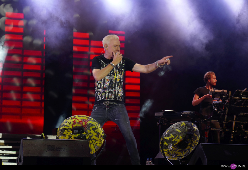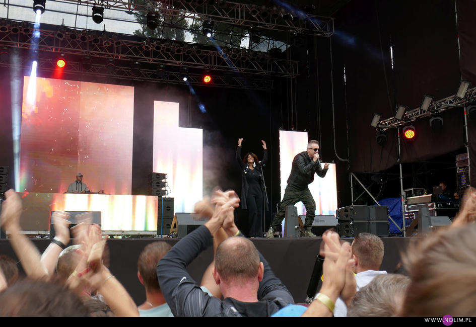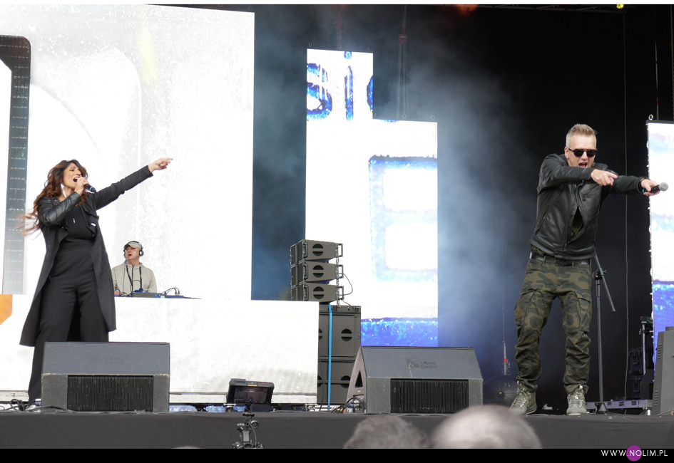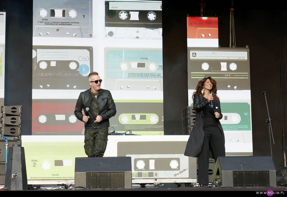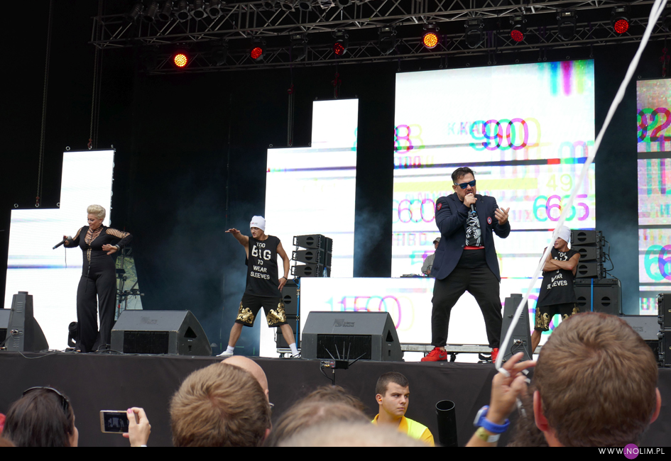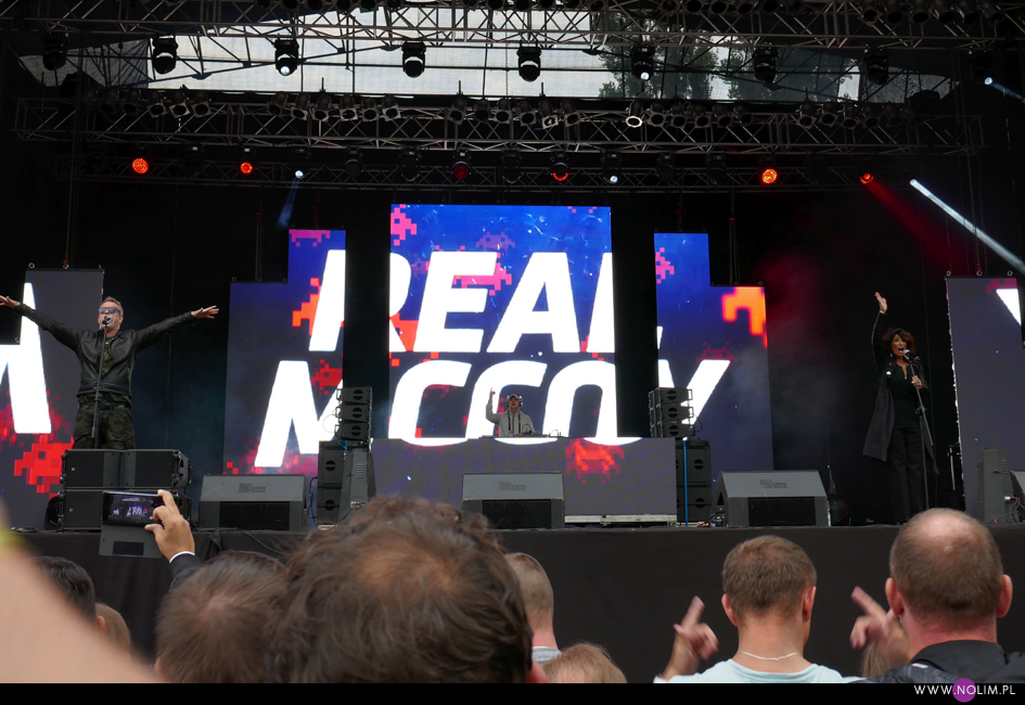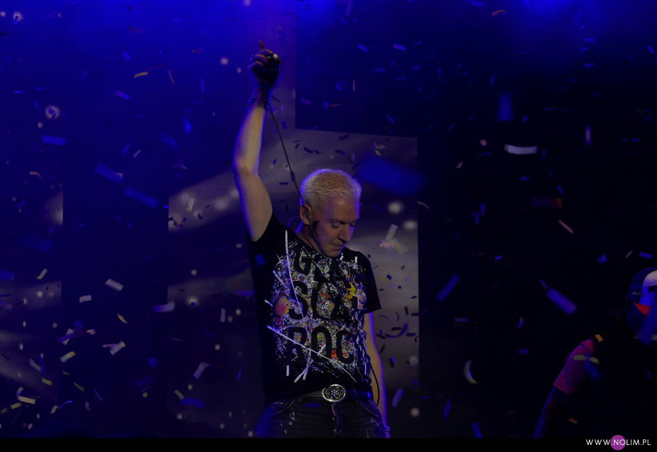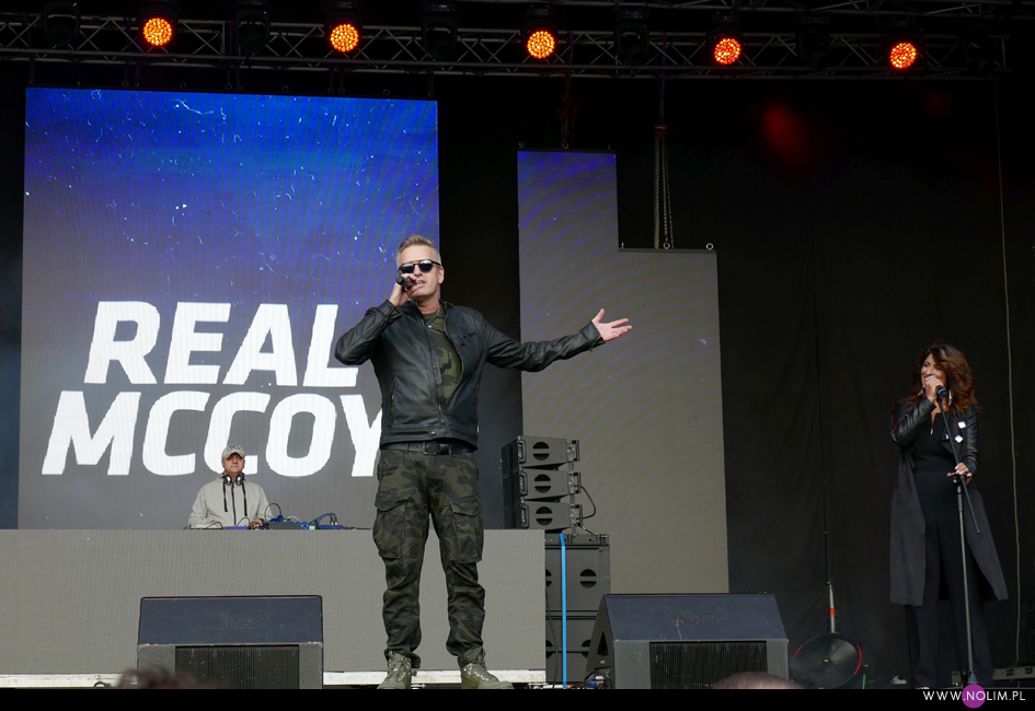 Zaraz po Maxx na scenie pojawił się (obecnie) duet Real McCoy. I w tym przypadku próżno było szukać na scenie Patricii Petersen, Vanessy Mason czy Lisy Cork, a więc najbardziej znanych twarzy zespołu. Obecnie ich miejsce zajmuje Karin Kasar czyli wokalistka, której głos faktycznie można usłyszeć w największym hicie zespołu, „Another night”. Tak więc Real McCoy okazał się kolejnym eurodance’owym spadkobiercą praktyk Milli Vanilli. I ten występ zaczął się od problemów technicznych, tym razem z niedziałającym mikrofonem podczas „Pump up the jam”, który według słów O-Jay’a nigdy wcześniej nie był wykonywany live. Przynajmniej dzięki temu było widać, że chociaż część wokali wykonywana jest na żywo. Olaf okazał się bardzo rozmownym gościem, dużo zagadywał do publiczności, żartował z ziewającego faceta i ze swojego wieku, a w pewnym momencie zniknął zupełnie ze sceny, by po chwili pojawić się wśród publiczności. I to nie w fosie, tylko naprawdę między ludźmi. Dosłownie był na wyciągnięcie ręki. Chociaż wcześniej nie byłam jakoś specjalnie entuzjastycznie nastawiona do wiecznie uśmiechniętej Karin, która swoją drogą sądząc po filmikach na YouTube, też śpiewa głównie z playbacku, to jednak na koncercie bawiłam się wyśmienicie. Twórczość Real McCoy znam dość dobrze, więc z uśmiechem na ustach wyśpiewywałam „Automatic lover”, „Love and devotion”, „Come And Get Your Love” a zwłaszcza „Run away”. Tu nastąpił chyba efekt „Walking in my shoes” (odsyłam do moich wspomnień z koncertu Depeche Mode w Warszawie w 2013r.) – nigdy jakoś bardzo nie lubiłam tej piosenki, a na żywo darłam się na niej i tańczyłam jak głupia. To był bardzo, bardzo fajny koncert, wesoły i pozytywny. Wróciła masa wspomnień.