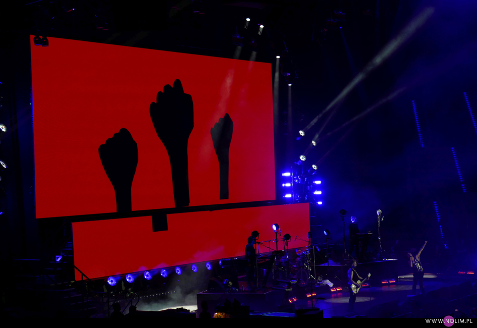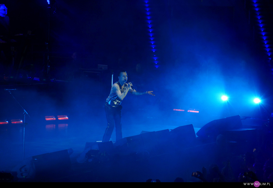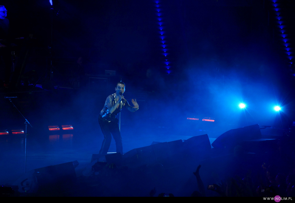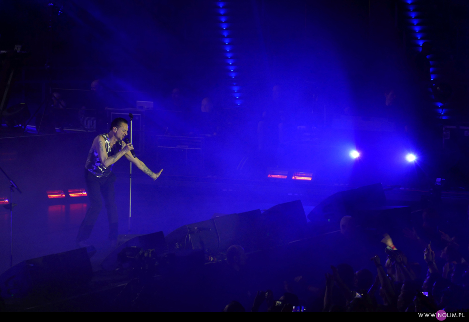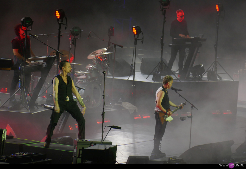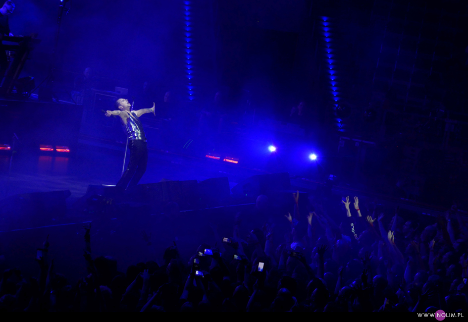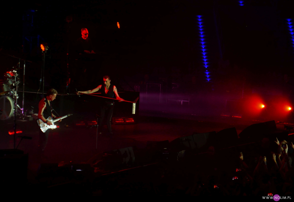 Koncert rozpoczął się punktualnie o 20:45. Na szczęście od razu wszyscy wokoło wstali. Później niektórzy siadali, ale ja przestałam cały koncert. Nie wyobrażam sobie siedzenia – wówczas zupełnie nie poczułabym klimatu. Wszystko działało jak w zegarku, punkt po punkcie, bez żadnych niespodzianek. Setlista była dość krótka – 20 piosenek – i w stosunku do Krakowa nastąpiła jedna zmiana, co też było do przewidzenia. Utworami wymiennymi zazwyczaj są te śpiewane przez Martina, dlatego jeśli w Krakowie zaśpiewał „Strangelove” (za którym nigdy nie przepadałam, ale chciałabym usłyszeć), to w Łodzi można było się spodziewać „I want you now”. Resztę setlisty stanowiły głównie starsze i znane utwory zespołu. Co zabawne promocja najnowszej płyty została zredukowana do zaledwie trzech piosenek, będących jednocześnie singlami – niezmiennie otwierającego show „Going backwards”, całkiem nieźle rozkręcającego się na żywo „Cover me” oraz „Where’s the revolution”. Największym zaskoczeniem dla mnie było pojawienie się w secie „Useless”- utworu, którego nie grali live od 20 lat. Może mnie jakoś nie powalił, ale miło było usłyszeć coś innego. Do setu powróciło sztandarowe „It’s no good”, które zawsze witam z uśmiechem na twarzy (chociaż tym razem miałam w trakcie pewne problemy techniczne, więc prawie w ogóle nie patrzyłam na scenę) i „A question of time”, które jest prawdziwym koncertowym killerem. Ponownie w Łodzi pojawiło się „Insight”, na które strasznie czekałam 4 lata temu i które wówczas uwieczniłam, dzięki czemu teraz mogłam się powydzierać. Zrezygnowałam natomiast z darcia się na „Home”, bo zorientowałam się, że z kolei tej piosenki nigdy nie nagrałam. Wstyd się przyznać, ale chyba skupiłam się bardziej na rejestracji wspomnień niż na przeżywaniu… Mój problem polega na tym, że to był zaledwie mój ósmy koncert, a czułam się jakbym widziała ich co najmniej dwa, o ile nie trzy razy tyle. Najjaśniejszym punktem występu było wg mnie „Everything counts”. Chociaż wiedziałam czego się spodziewać, bo przecież słyszałam już tę wersję, to jednak tym razem dyskotekowy początek połączony z grą świateł wywarł na mnie o wiele większe wrażenie niż pół roku wcześniej w Warszawie. Podobnie dobrze bawiłam się przy „A question of time”, a i „Cover me” doceniałam jakoś bardziej.