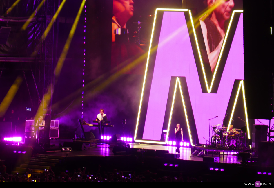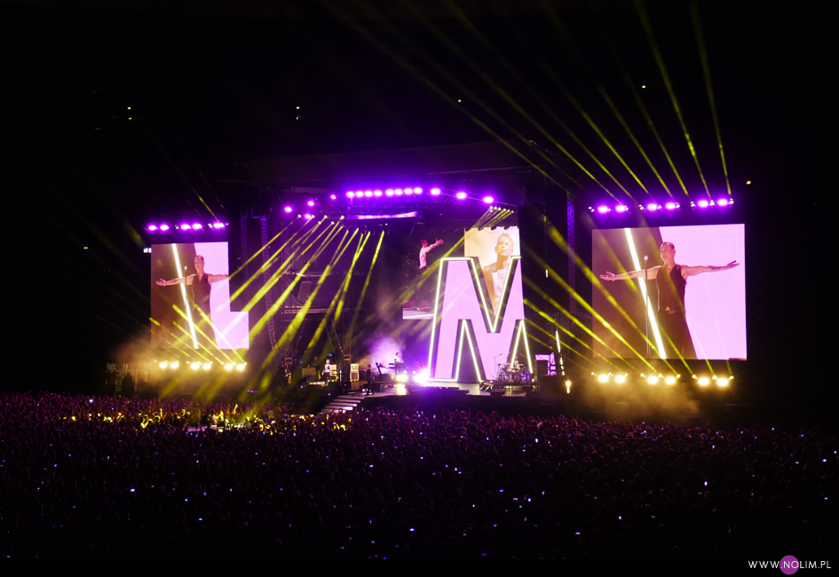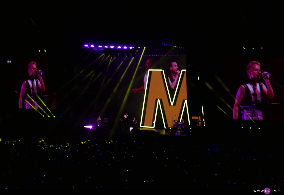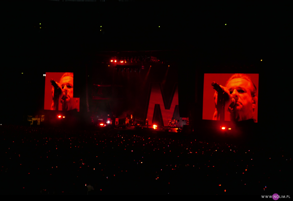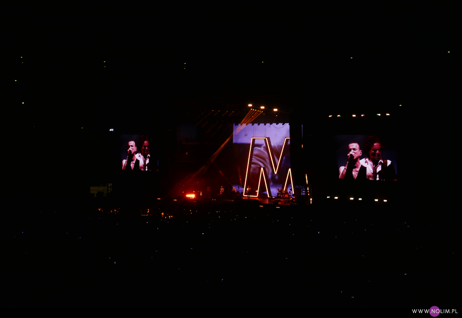 Byłam ciekawa jak ocenię ten koncert zaledwie kilka dni po Rammsteinie, który jest przecież bardzo widowiskowy, i prawdę mówiąc myślałam, że będzie gorzej. Owszem, scena Depeche Mode przy R+ wygląda jak z dożynek w Pcimiu Dolnym, ale gdy koncert się rozpoczyna, nieco zyskuje. Zresztą oni nigdy, może poza Devotional Tour, nie mieli specjalnie spektakularnych instalacji. Dwa duże telebimy, może niezbyt odkrywcze i piękne, ale za to praktyczne, robią robotę. Widać na nich dobrze i Dave’a, i Martina, którzy z mojego sektora na scenie byli jedynie małymi punktami. Na wizualizacje pokazujące się na środkowym ekranie, nie zwróciłam szczególnej uwagi. Zresztą one i tak ostatnimi laty stawały się coraz bardziej dziwne i od czapy. Za to wielka litera M, stanowiąca punkt centralny sceny, wydaje mi się jednak trochę samotna. Brakuje jej drugiego M, aby utworzyć inicjały “Memento mori”… ale z drugiej strony to też inicjały np. Marilyna Mansona. Lub chociaż D, aby powstało DM, tak jak w 1998 roku. Tamtą instalację naprawdę lubiłam.