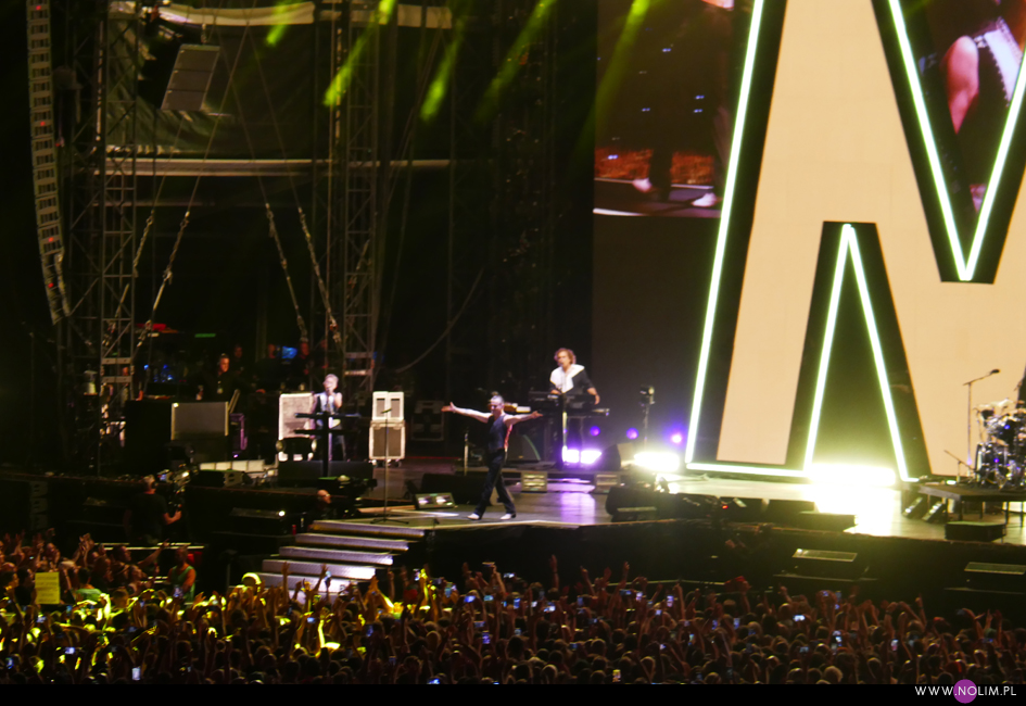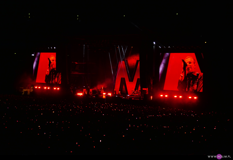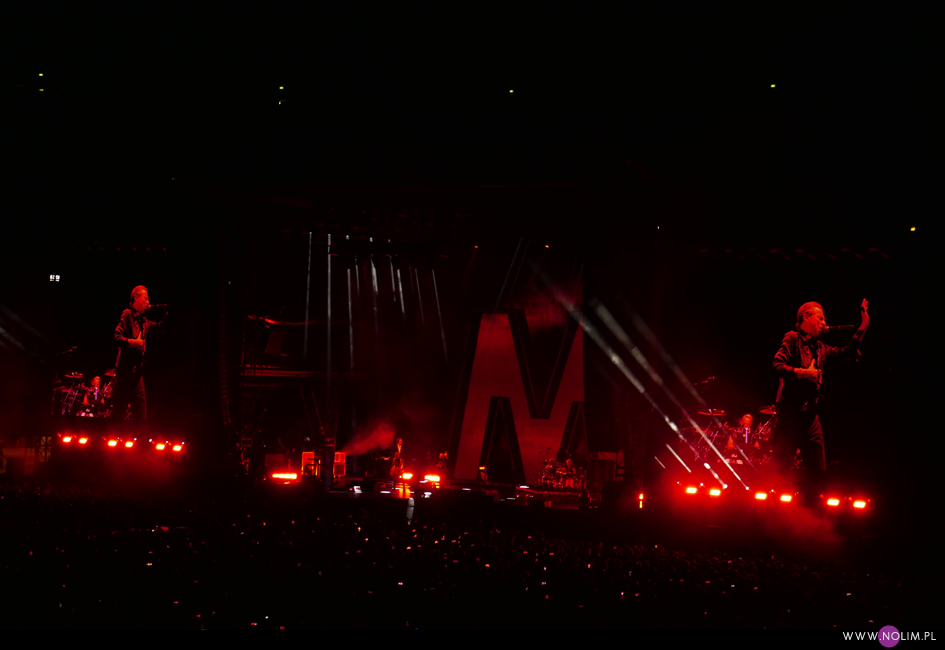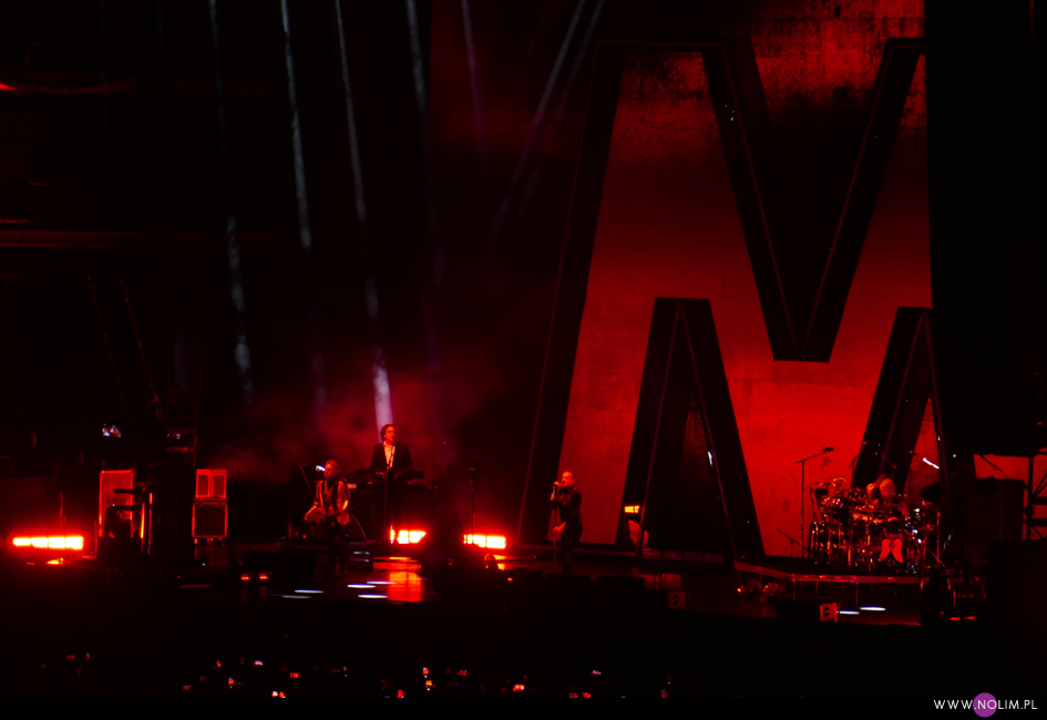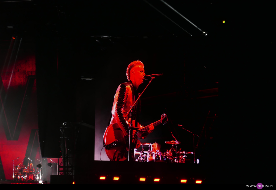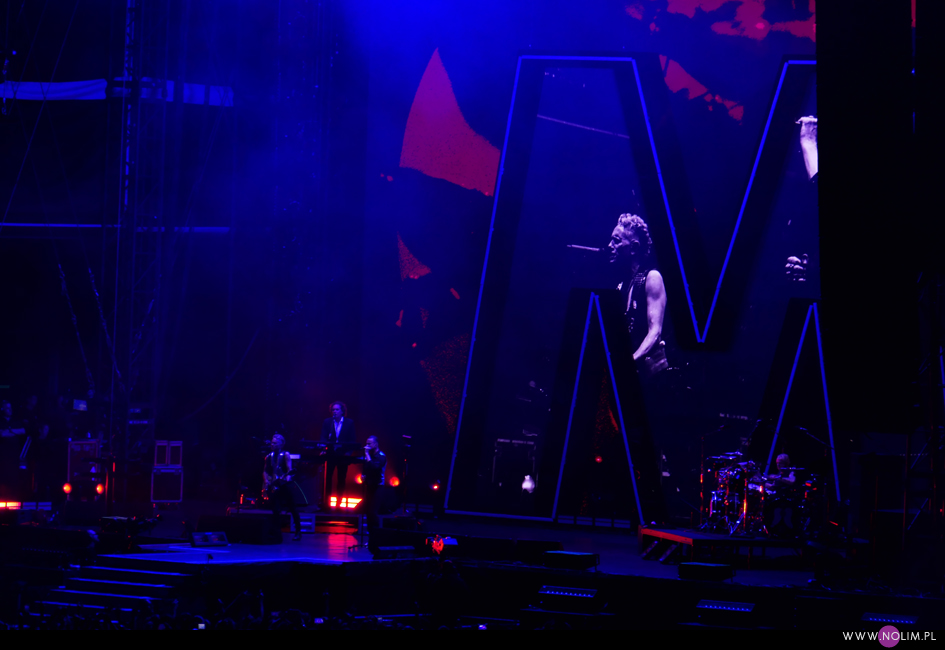 Byłam ciekawa jak ocenię ten koncert zaledwie kilka dni po Rammsteinie, który jest przecież bardzo widowiskowy, i prawdę mówiąc myślałam, że będzie gorzej. Owszem, scena Depeche Mode przy R+ wygląda jak z dożynek w Pcimiu Dolnym, ale gdy koncert się rozpoczyna, nieco zyskuje. Zresztą oni nigdy, może poza Devotional Tour, nie mieli specjalnie spektakularnych instalacji. Dwa duże telebimy, może niezbyt odkrywcze i piękne, ale za to praktyczne, robią robotę. Widać na nich dobrze i Dave’a, i Martina, którzy z mojego sektora na scenie byli jedynie małymi punktami. Na wizualizacje pokazujące się na środkowym ekranie, nie zwróciłam szczególnej uwagi. Zresztą one i tak ostatnimi laty stawały się coraz bardziej dziwne i od czapy. Za to wielka litera M, stanowiąca punkt centralny sceny, wydaje mi się jednak trochę samotna. Brakuje jej drugiego M, aby utworzyć inicjały “Memento mori”… ale z drugiej strony to też inicjały np. Marilyna Mansona. Lub chociaż D, aby powstało DM, tak jak w 1998 roku. Tamtą instalację naprawdę lubiłam.
