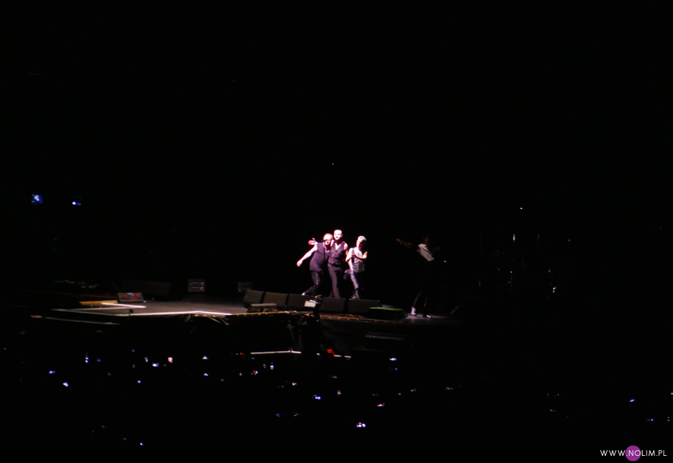Byłam pod takim wrażeniem, że aż nie rozpoznałam “Strangelove”, mimo że śpiewałam tekst. Tu z kolei był powrót do schematu – Martin na wokalu, Gordeno na klawiszach, reszta odpoczywa. I całe szczęście, bo jakby zagrali w wersji z płyty, to jeszcze nagle bym się zakochała. Szczerze mówiąc liczyłam nawet trochę na znienawidzone przez niektórych, bo grane milion razy “Home” – znów miałam ochotę się powydzierać. Ale w sumie może nawet dobrze, że nie było, bo trochę zmarzłam w czasie nocnego powrotu z Rammsteina i nie jestem do końca zdrowa. Tymczasem na tym etapie koncertu nie pamiętałam już za bardzo co, oprócz sztandarowych hitów, zostało jeszcze w setliście, dlatego “Ghosts again”, który zaczął się nagle i niemal od czapy, prawie mnie zaskoczył. Ale przecież to pierwszy singiel z nowej płyty, więc musiał się pojawić. Zdziwiłam się natomiast, że dopiero tak późno. W wersji koncertowej nie wywarł na mnie jakiegoś szczególnego wrażenia. Jedyną refleksję, jaką mam, to to, że podarowałabym mu dłuższy wstęp, coś na wzór “Precious”, które zaczyna się od gitarowego motywu Martina.