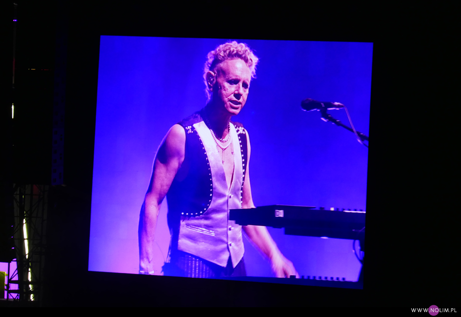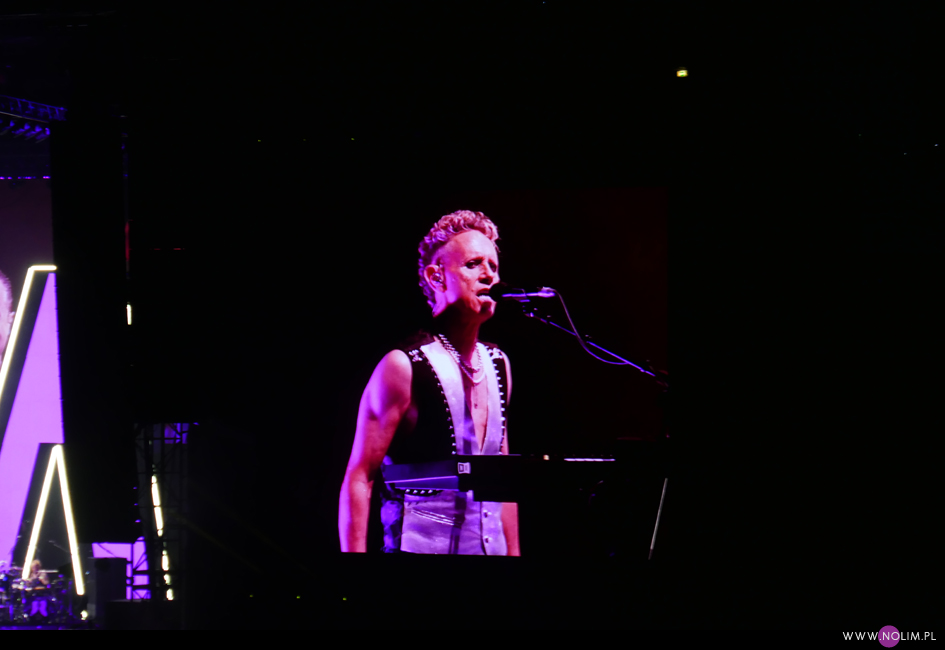 Po tym miłym i ładnym kawałku nastąpiła totalna zmiana tematu. Ostatni utwór z wiecznej SOFADowej trójcy – “I feel you”, a po nim kolejny z mocnym gitarowym motywem – “A pain that I’m used to”, grany jednak cały czas w zremiksowanej wersji. A potem nadszedł kolejny ważny moment koncertu – “World in my eyes”, będący hołdem dla zmarłego w zeszłym roku Andrew Fletchera. Gdy na telebimach pojawiły się jego zdjęcia, sektory G, mieszczące się naprzeciwko sceny, miały zapalić światełka, by ułożyć z nich napis “Fletch”. Wszystko było bardzo ładnie rozpisane w internecie, które dokładnie miejsca mają się świecić, ale informacje chyba nie dotarły do wszystkich, bo najlepiej widoczne były dwie ostatnie litery, zaś pierwsze prawie wcale. W dodatku “C” wyglądało jak “E”. Gdybym nie wiedziała o co chodzi, to nie wiem czy bym się domyśliła, że cokolwiek jest tam napisane i zapewne nic bym nawet nie widziała, bo żeby zobaczyć te sektory, musiałam się sporo obrócić. Nic więcej jednak, oprócz kilku zdjęć Fletcha z czasów “Violatora” nie było. Żadnego patosu, okrzyków, skandowania, nic z tych rzeczy. Jedynie na końcu Dave wymienił jego nazwisko. Wszystko w typowym, minimalistycznym depeszowym wydaniu.